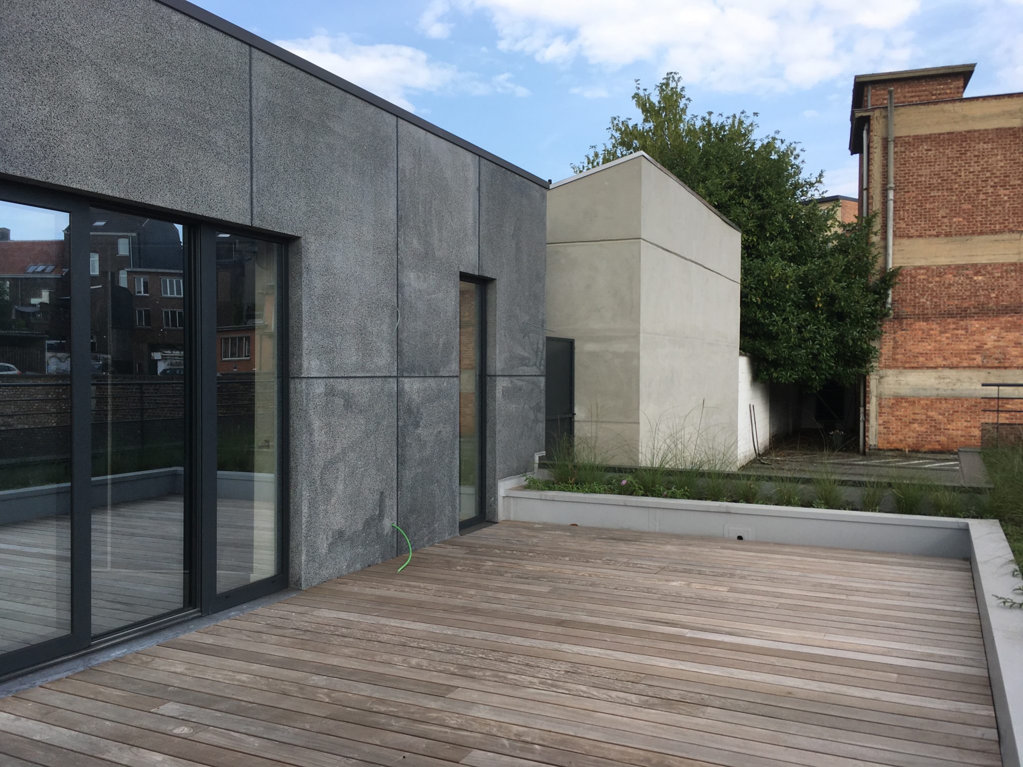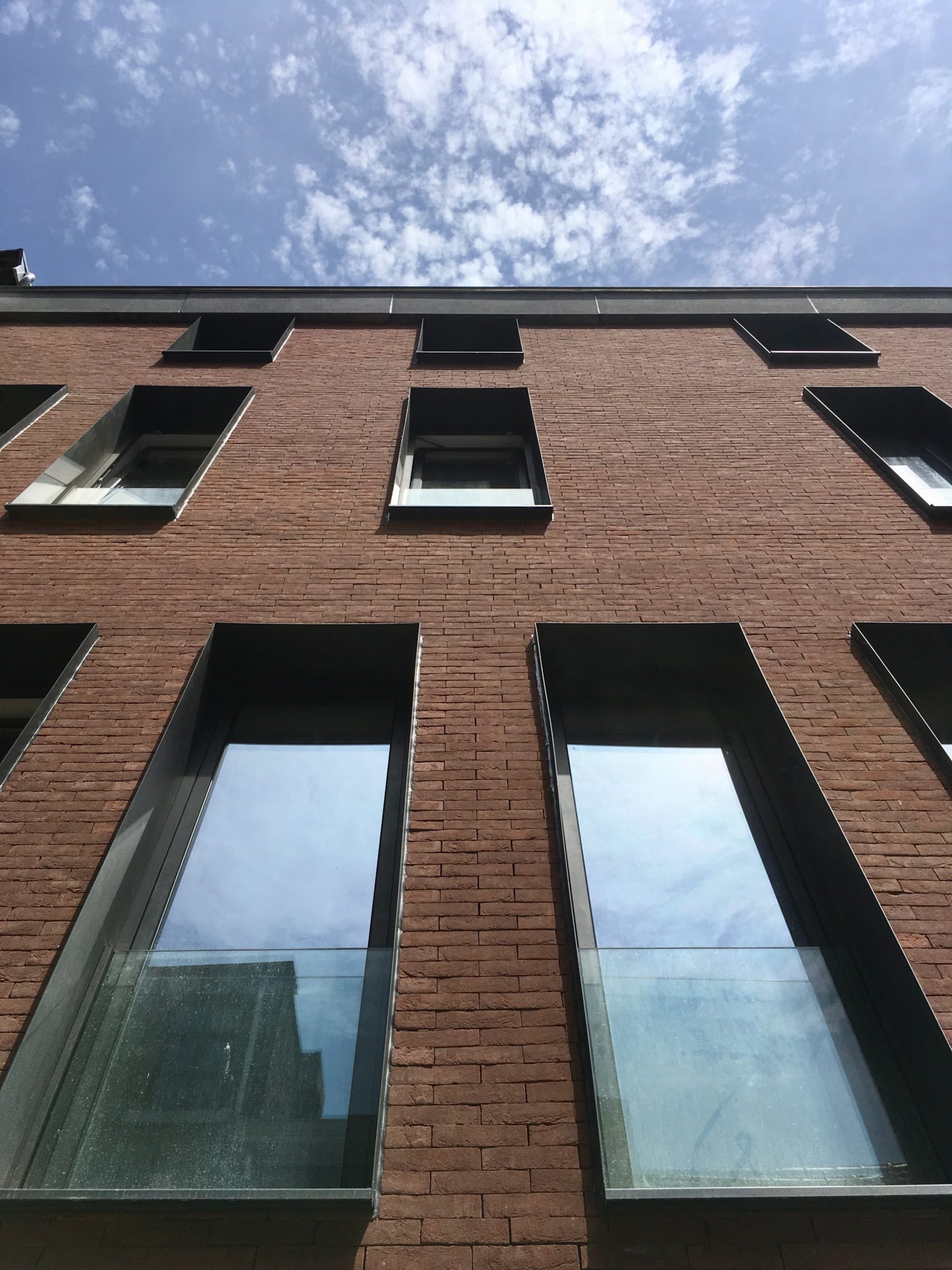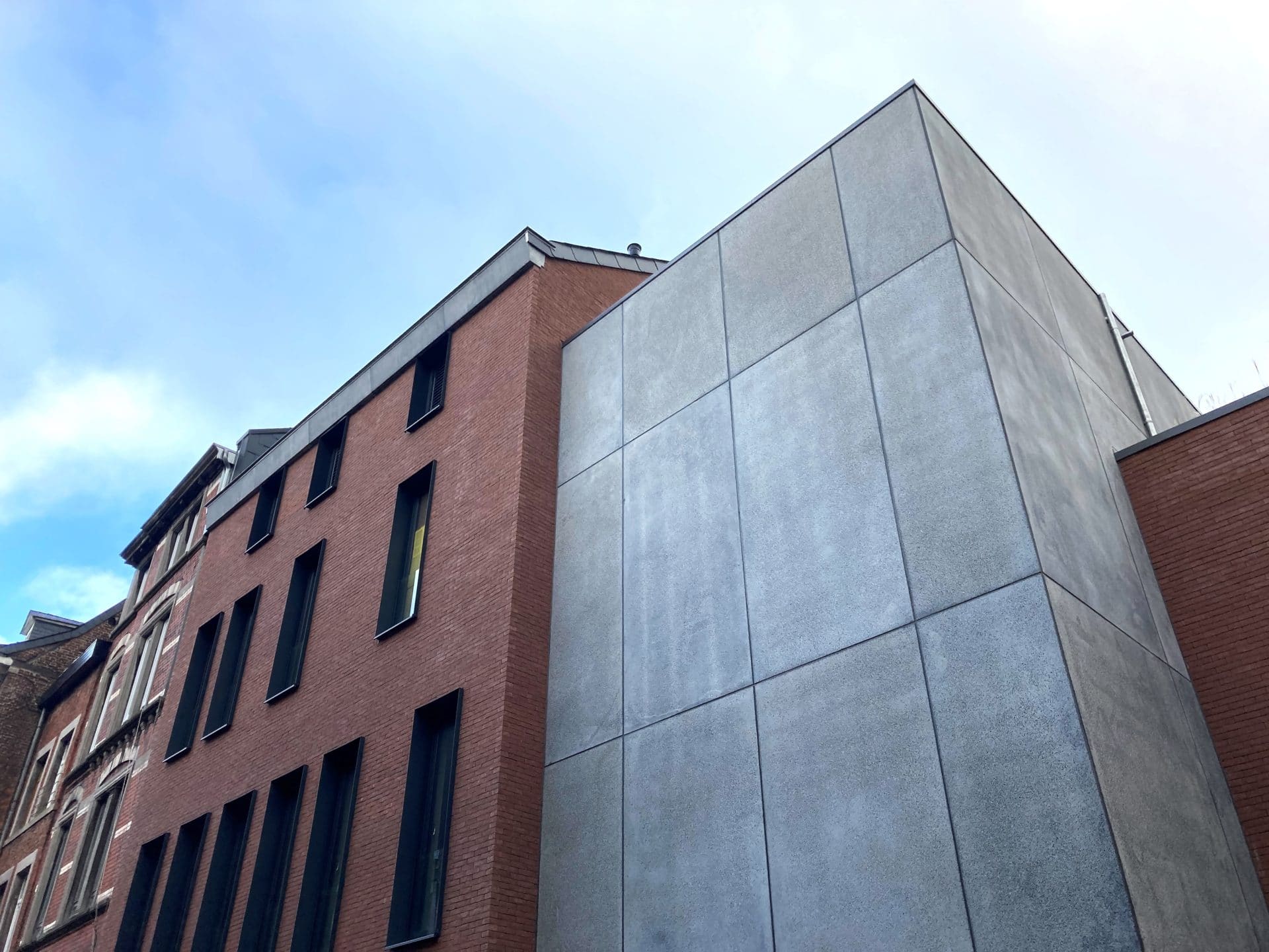 En façade on croit presque voir trois constructions indépendantes : deux bâtiments en briques rouges, de hauteurs différentes, séparés par une tour en béton architectonique gris. A l’intérieur, par contre, une continuité unit les différentes zones.